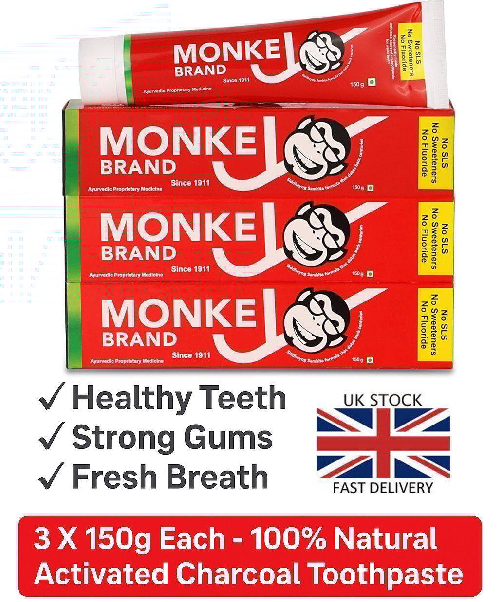 3 × 150g Monkey Charcoal Activated Tooth Powder Toothpaste Fluoride & SLS-Free
