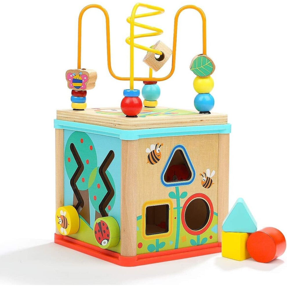 TOP BRIGHT Wooden Activity Cube 5-in-1 Wooden Activity Table for Kids and Babies Age 1, 2 year olds Educational Centre with Bead Maze and Sor