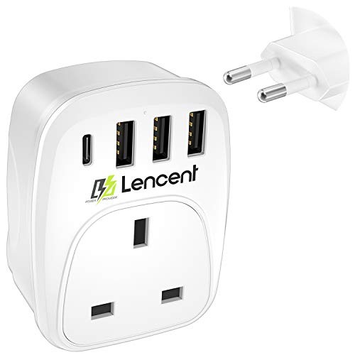 LENCENT UK to European Plug Adapter with 3 USB Ports and 1 Type C, Grounded EU Euro Europe Travel Adapter for Germany Spain France Portugal Greece Russia Morocco Turkey Poland and more (Type E/F)