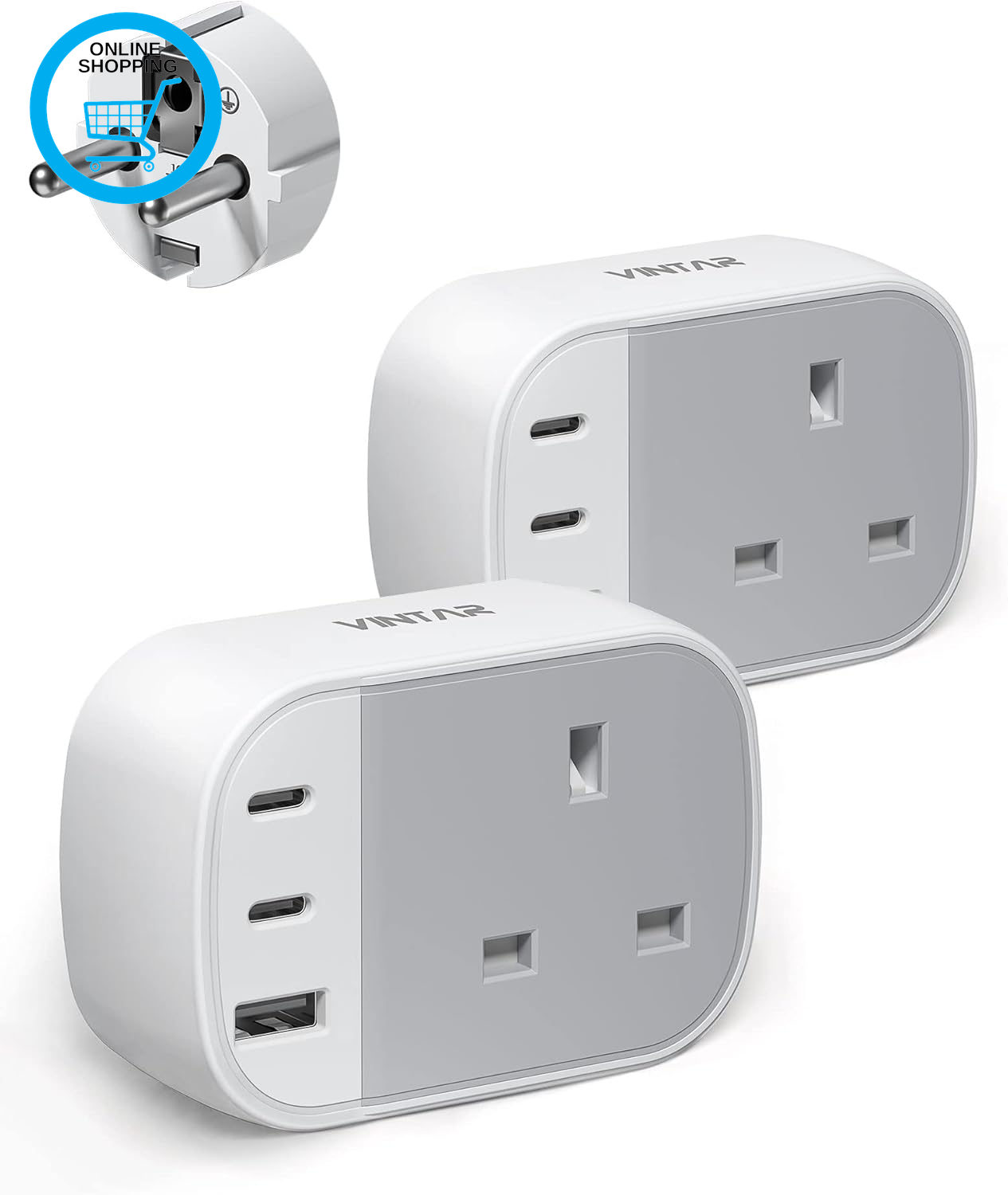 UK to European Plug Adapter, Grounded Europe Travel Adapter with 2 USB C 1 USB