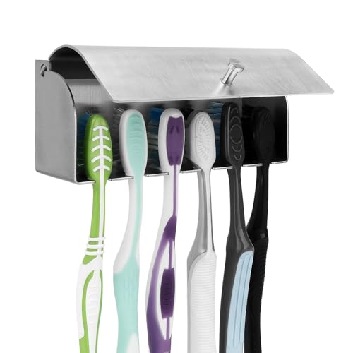 Linkidea Wall Mount Toothbrush Holder with Cover for Bathroom, Shower, Stainless Steel Self Adhesive 6 Slots Tooth Brush Organizer