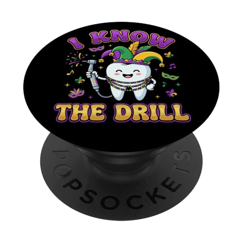 I Know The Drill Fun Mardi Gras Dental Assistant Tooth Pun PopSockets Adhesive PopGrip