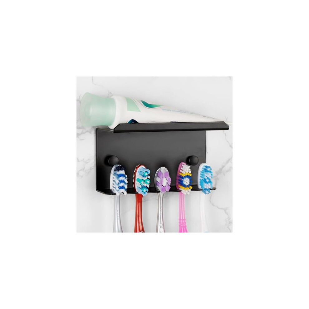 Linkidea Wall Mounted Toothbrush Holder for Shower, Aluminum Self-Adhesive 5 Slots Tooth Brush and Toothpaste Organizer Hanger Compatible with Colgate Extra Clean, Oral-B CrossAction (Black)