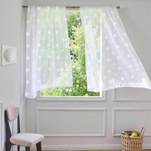 TOPICK White Net Curtains with Coast Star Pattern for Windows, Semi Sheer Voile Curtains 54 Inch Drop, Back Tab & Rod Pocket Light Filtering Curtain 2 Panels for Bedroom, Living Room, W55xL54 Inch