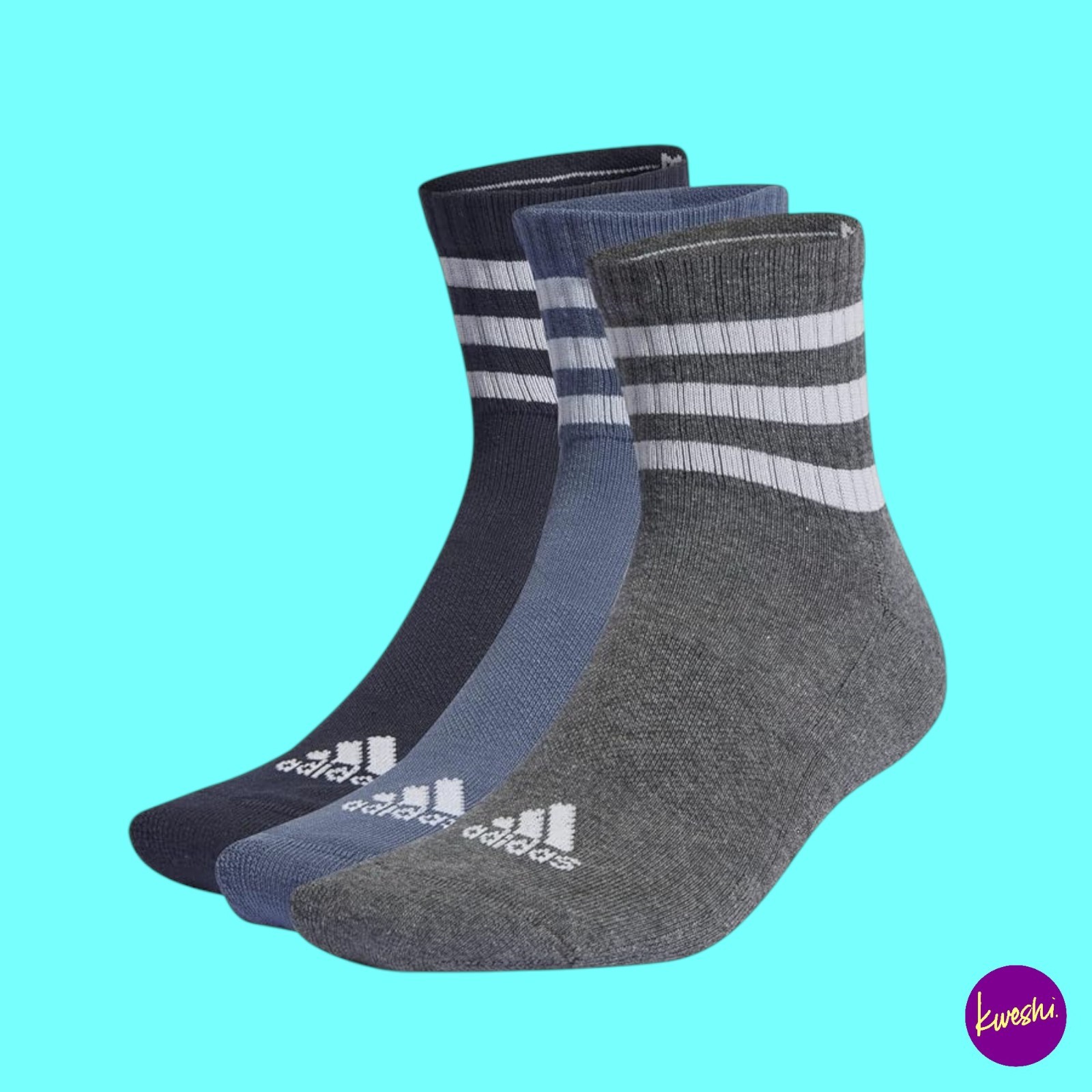 ADIDAS Unisex 3-Stripes Cushioned Mid-Cut Socks, 3-Pack, Grey Heather, UK M