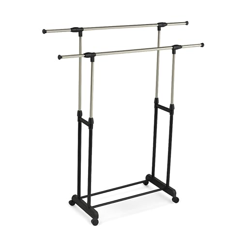 Relaxdays garment rack, mobile, adjustable double clothes rail, 148 cm height, 85–141 cm width, silver/black, Plastic, Stainless steel, 148 x 141 x 42 cm