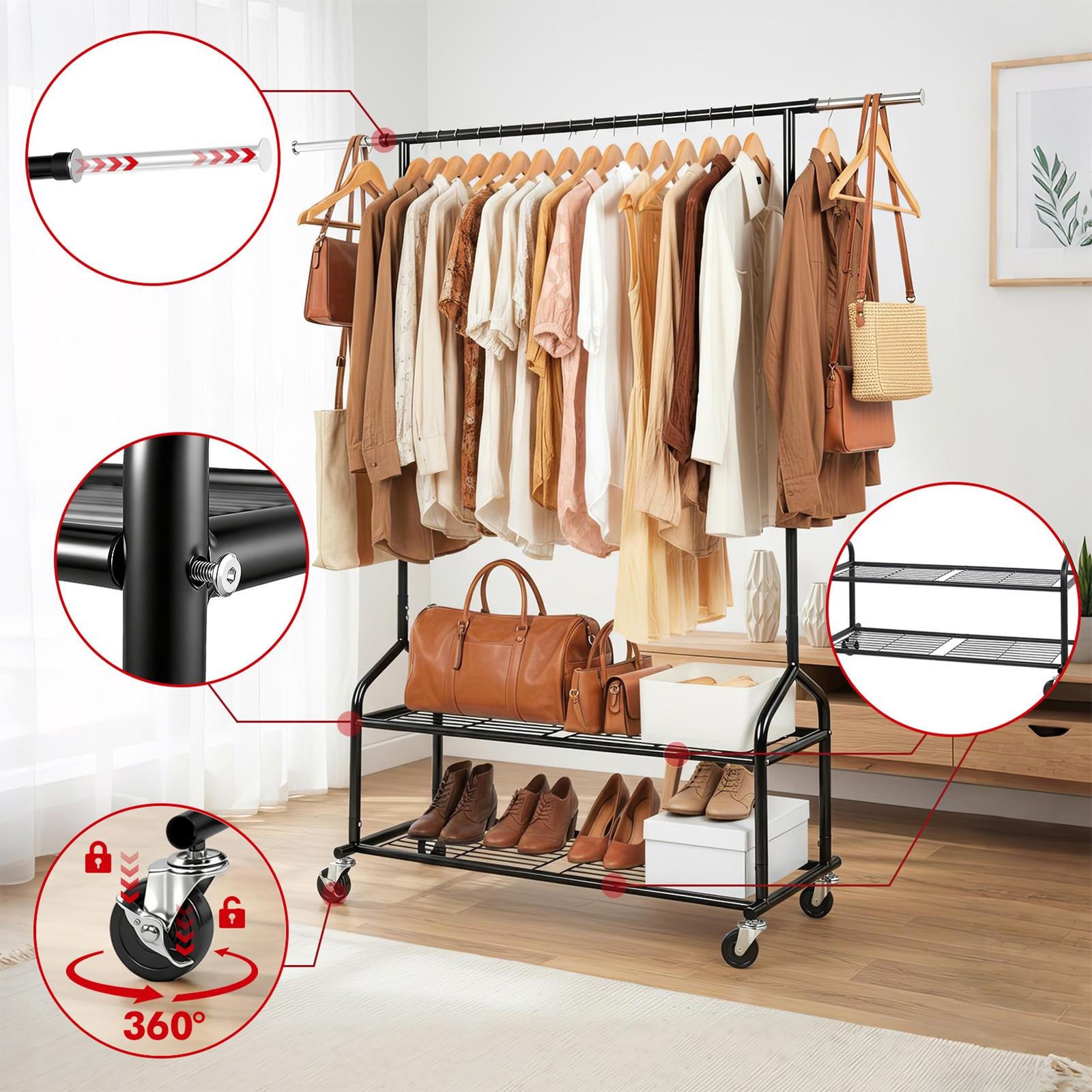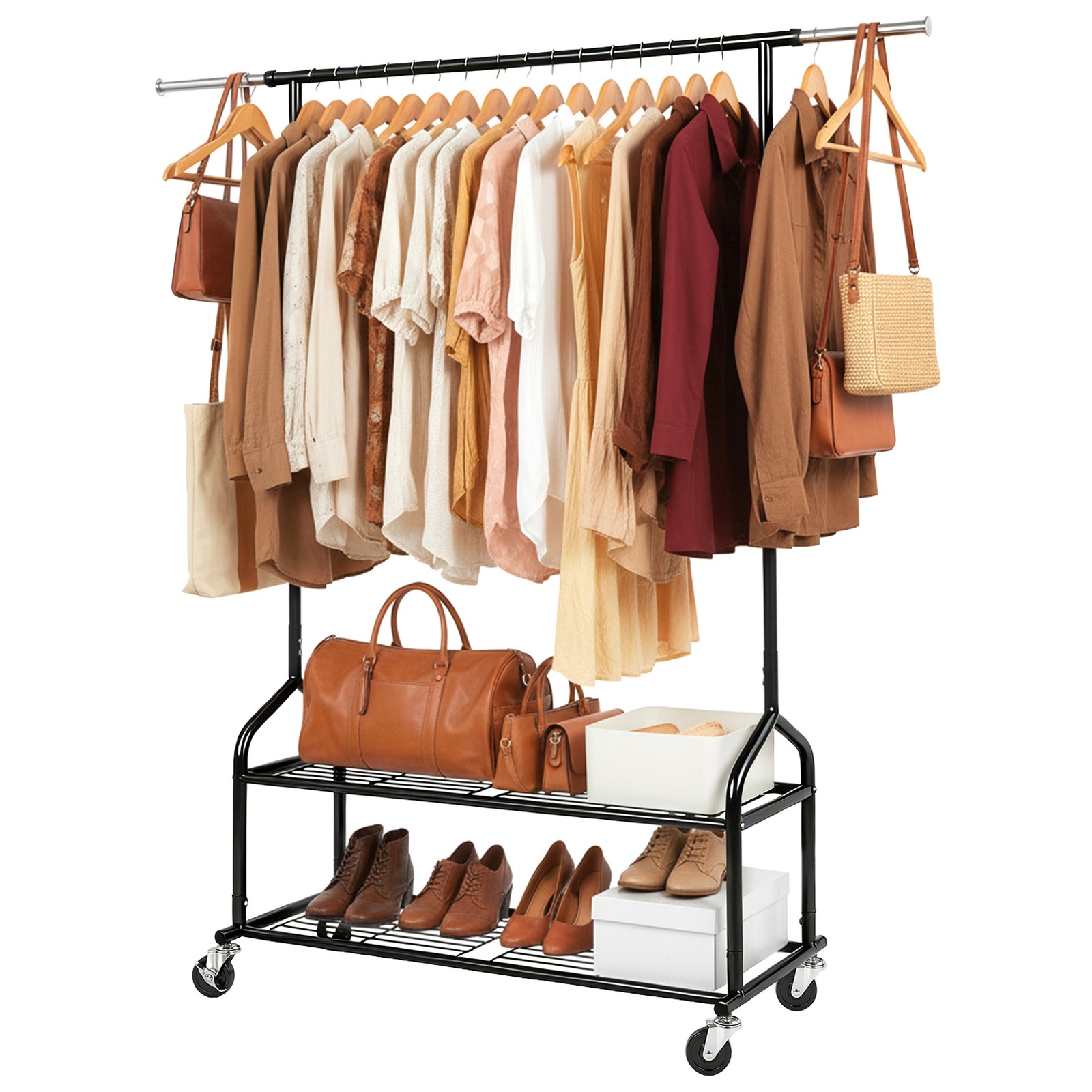2-Tier Rolling Garment Rack, Adjustable Clothes Rail with Wheels, Mobile Storage Stand