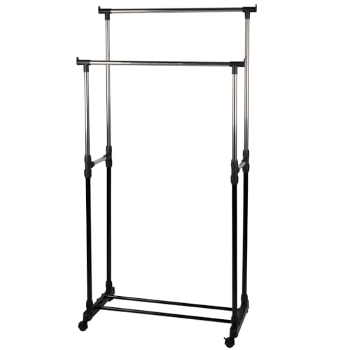 alpina Adjustable Double Mobile Clothes Rail with Wheels and Hooks - Black