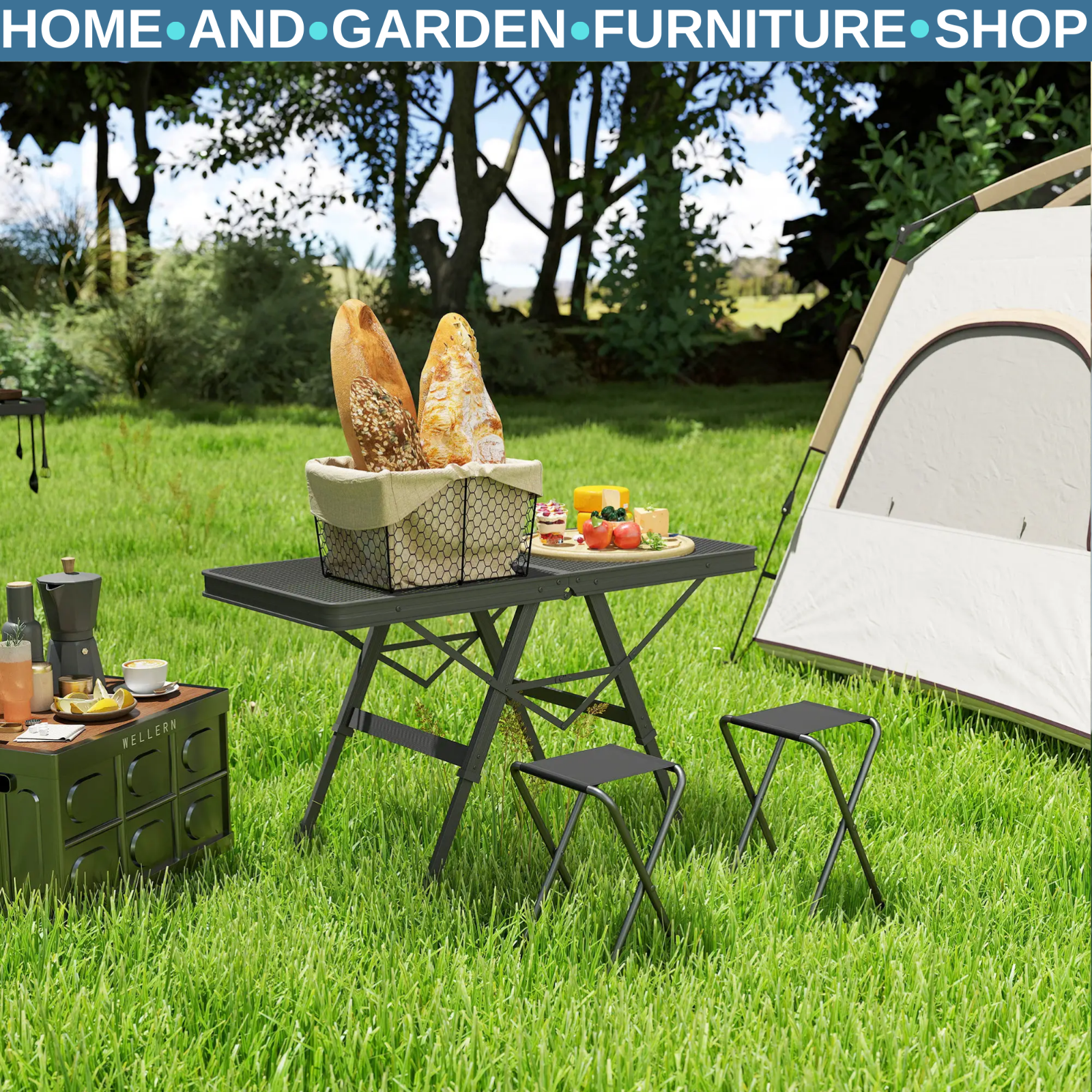 Folding Camping Table Adjustable Height Outdoor Picnic Table Metal Legs Mesh Top