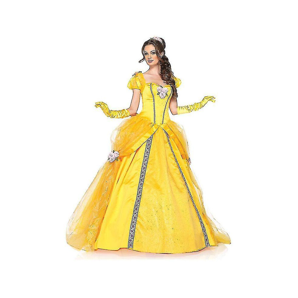 Women Belle Dress with Gloves Adult Princess Fancy Dress Up Outfits Halloween Party Carnival Costume Fairy Tale Beauty and The Beast Cosplay Stage Performance Dance Yellow Long Gown M
