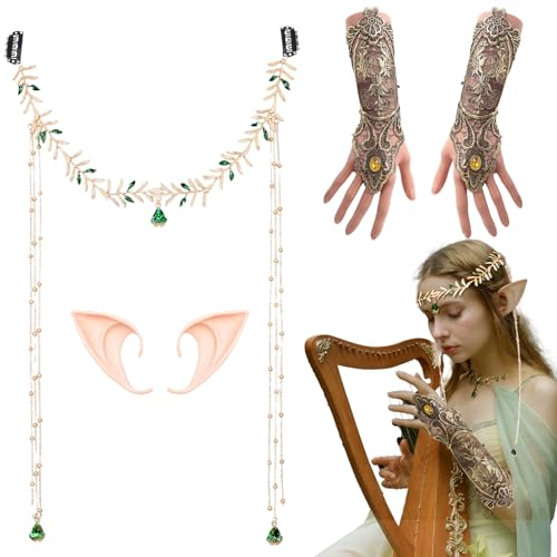 MUNSKT Renaissance Elf Costume Accessories Set Fairy Headpiece Elf Ears, Lace Gloves Forest Renaissance Halloween Wedding Bridal Shower Adult Fairy Costume Accessories