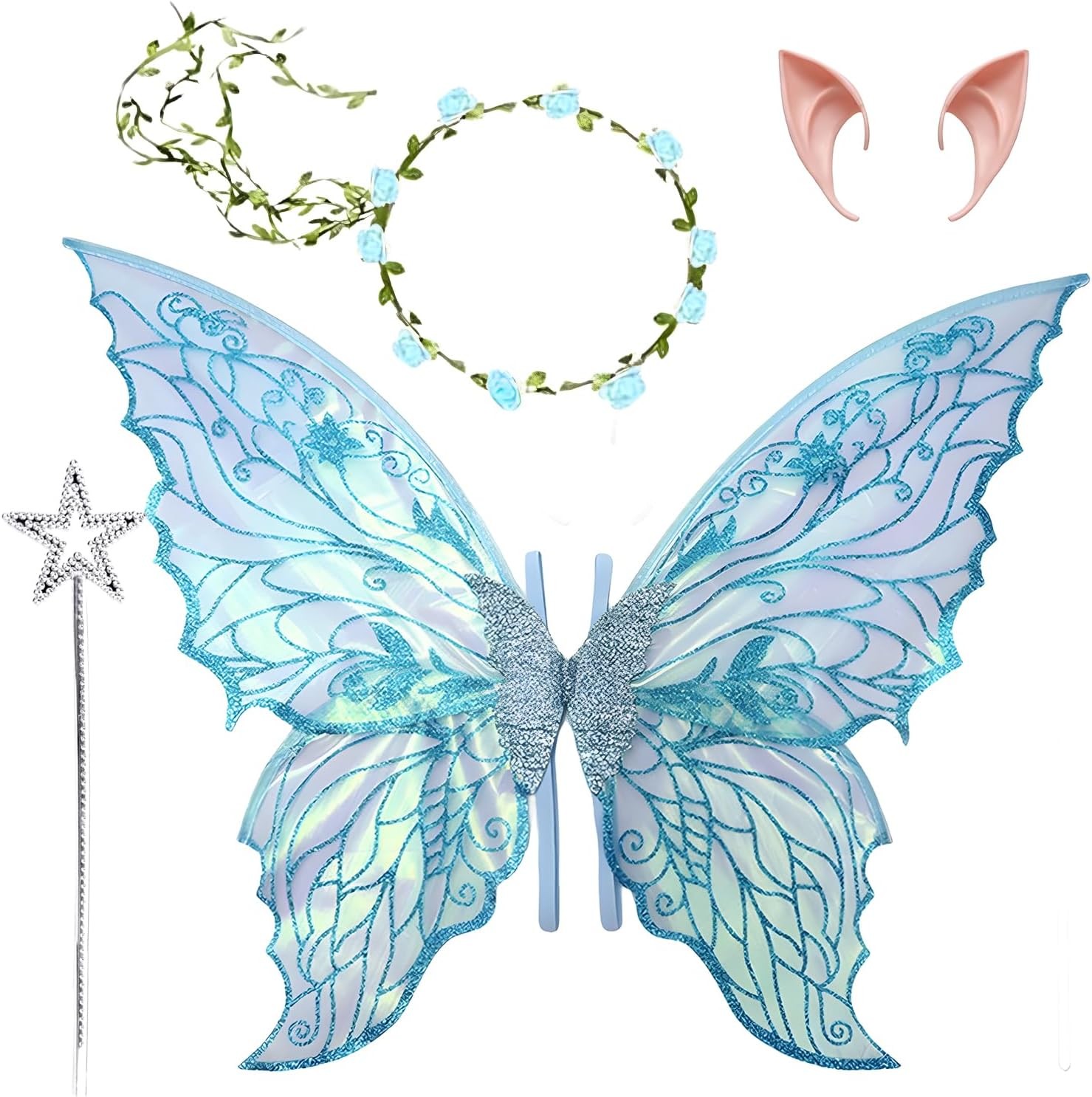 Ruichi Fairy Wings for Adult, Fairy Wings Costume for Adult Kids, Halloween Christmas Costume, Butterfly Wings Dress Up, Fairy Costume Set with Wands, Flower Headband, Elf Ears