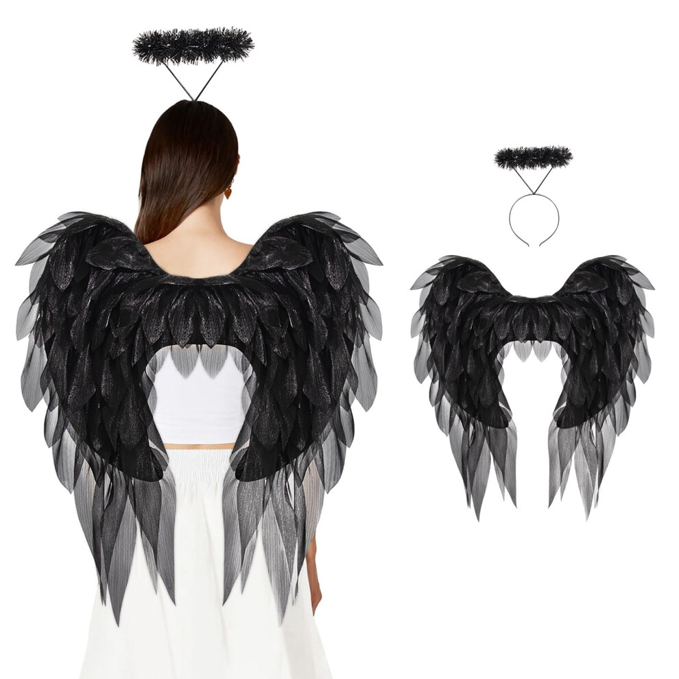 Lizzy Adult Fairy Angel Costume Includes Halo, Feather Wings, Girls Ladies Short & Sexy Tutu Skirt | Women's Halloween Christmas Fancy dress Costume Accessories (Black Angel)