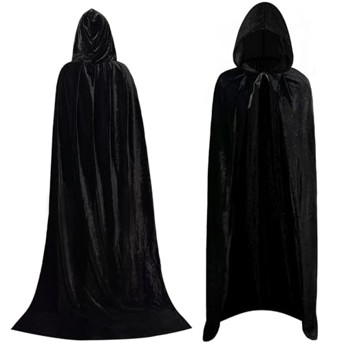 LYINUR Halloween Black Velvet Hooded Cape, Vampire Costume Black Cloak with Hood, Maleficent Medieval Cloak Wizard Devil Vampire Cape Grim Reaper Costume, Men Womens Halloween Costumes Adult, L