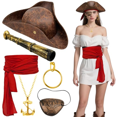 Halloween Pirate Costume Set with Pirate Hat, Red Waist Scarf; Telescope; Anchor Necklace, Earring Eye patch Fancy Dress Pirate Costume Adult Women for Halloween Party