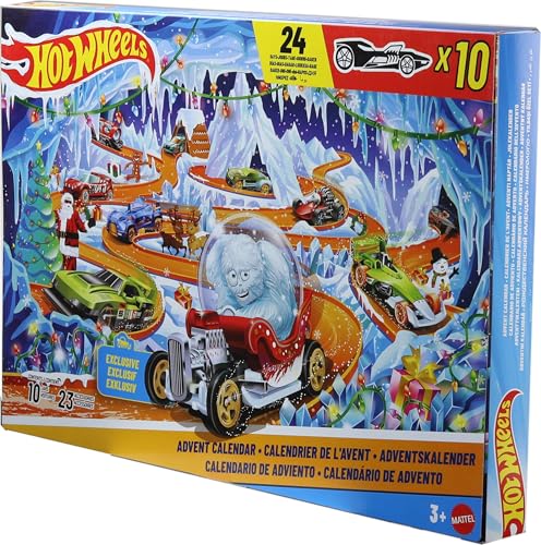 Hot Wheels Toy Cars & Playset, 2026 Advent Calendar with 10 Vehicles in 1:64 Scale, 14 Winter-Themed Accessories & 10 Ornament Clips, JLG41