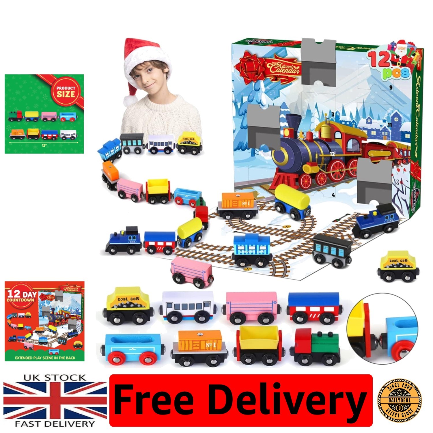 JOYIN 2024 Christmas Advent Calendar Countdown Calendar with 12 PCS Wooden Train Cars Magnetic Train Sets 12 Days Cars Advent Calendar for Boys Kids