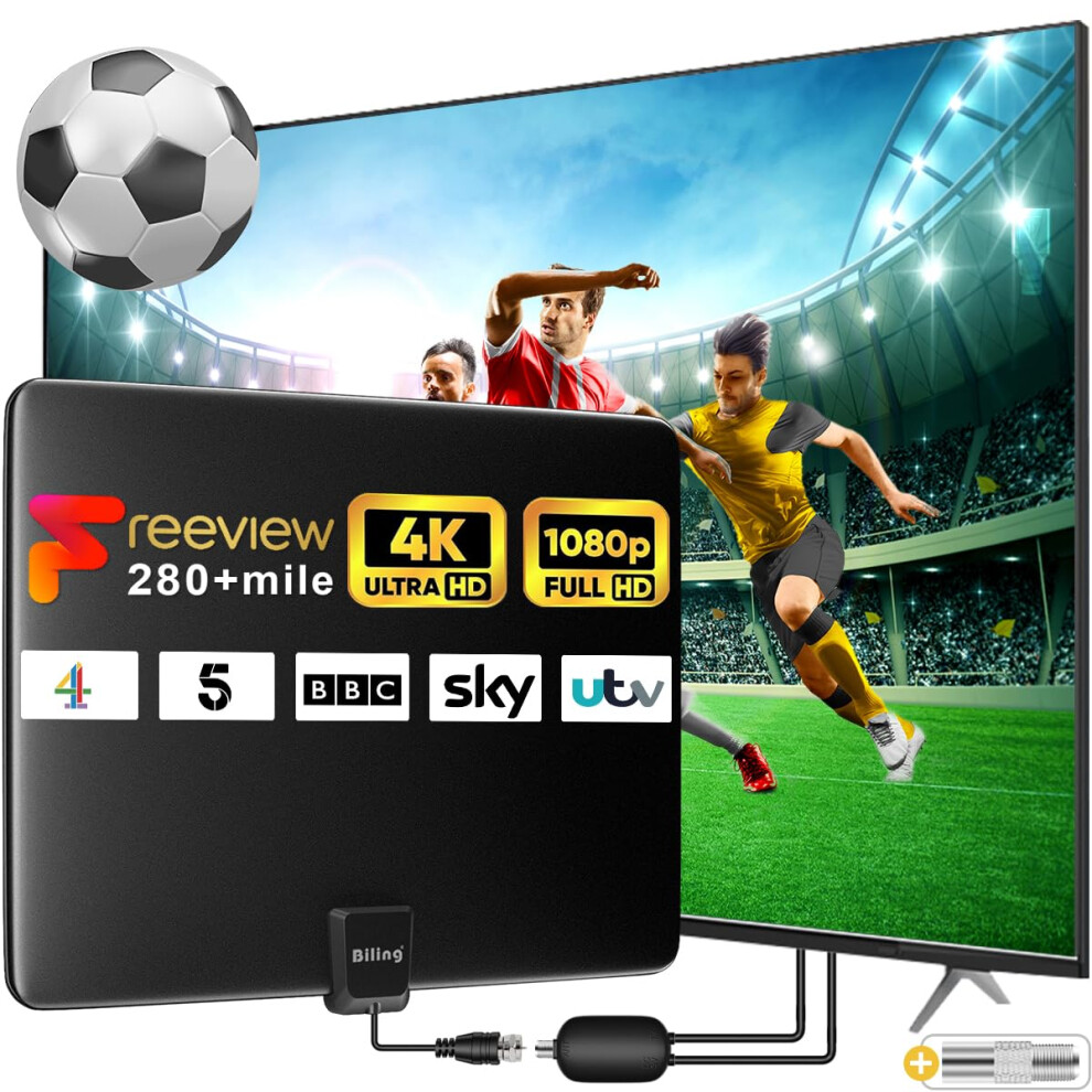 TV Aerial Indoor, Indoor Aerial for Smart TV with Strong Signal Booster UK, 280+ Miles for Freeview Digital TV Antennas 4K 1080P Ultra HD, VHF/UHF/FM