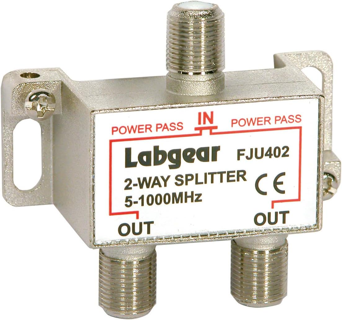 Labgear 2 Way UHF TV Aerial Splitter – Signal Distributor, Power Pass All Ports, 75 Ohm F Type Connector, Freeview and Digital TV, Zinc Die Cast, 5-1000MHz