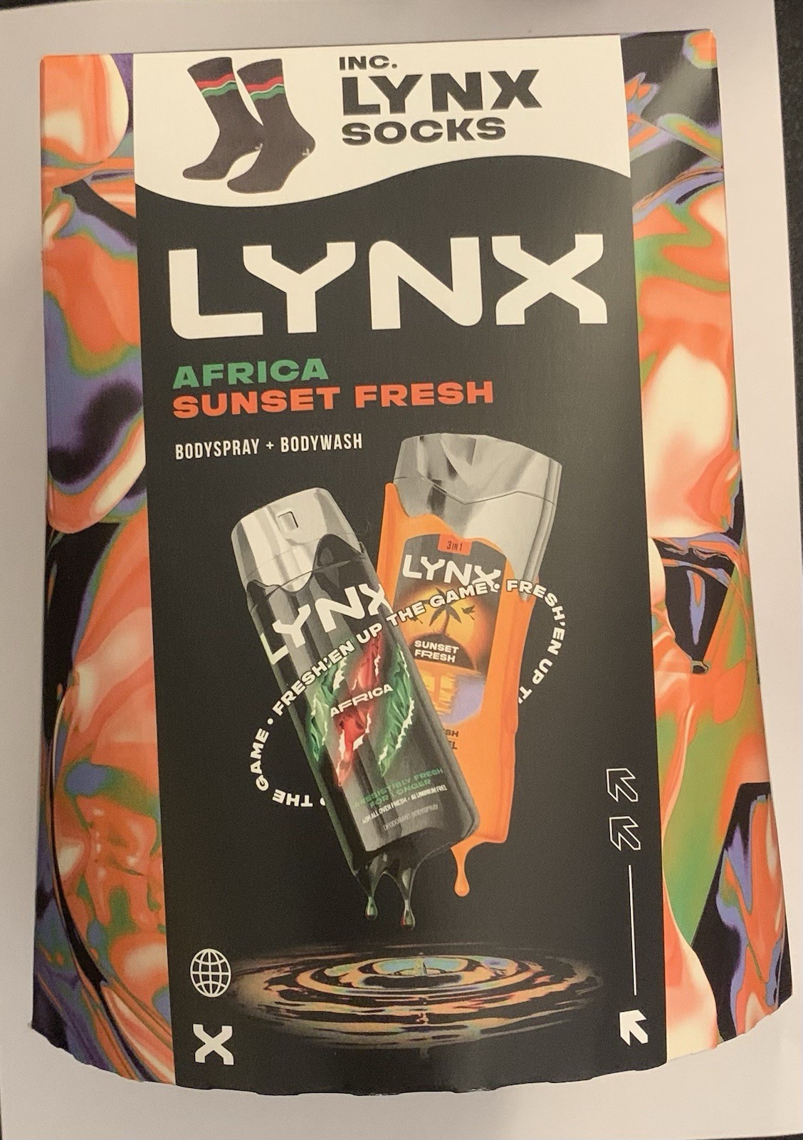 Lynx Gift Set Africa & Sunset Fresh with a body spray, a body wash and Socks perfect gifts for him 2 piece