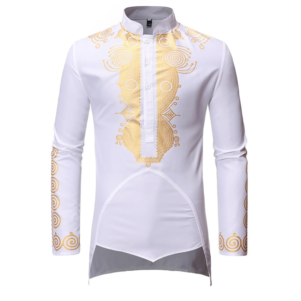 Long Sleeve Shirt Dashiki African Outfit For Men 3XL 01 White StandUp Collar Traditional Print Blouse