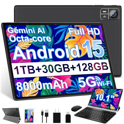 SUAAT Android 15 Tablet 30GB RAM 128GB ROM 1TB Expand, 10.1 inch Tablets with Keyboard Mouse, Octa-Core, 8000mAh, IPS HD Display, 5G WiFi BT 5.0 GPS, Widevine L1, Gemini AI, Camera