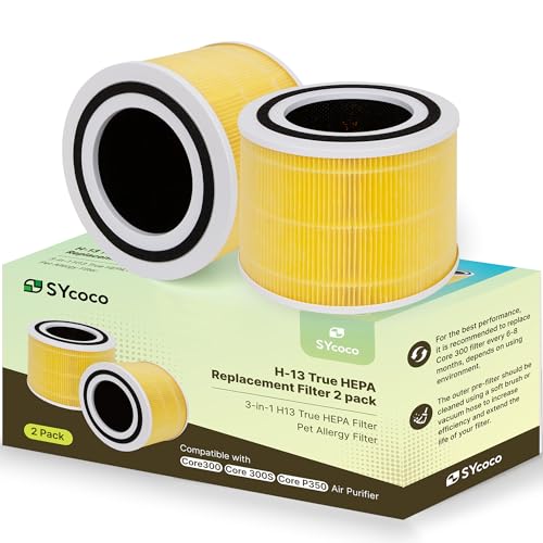 SYcoco Air Purifier Filter Replacement for Home Core Purifiers - High Efficiency 3-in-1 H13 True HEPA Filter, Yellow, 2Pack (Levoit Core 300 Compatible)