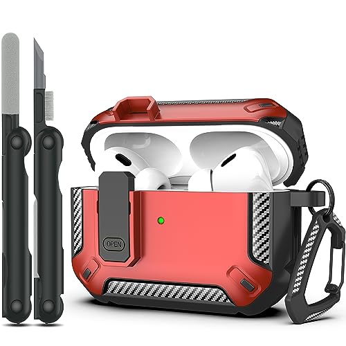 RFUNGUANGO compatible with AirPods Pro 2nd case protective case with cleaning kit, military hard shell protective case with lock for AirPod Pro case(2023/2022/2019),Red