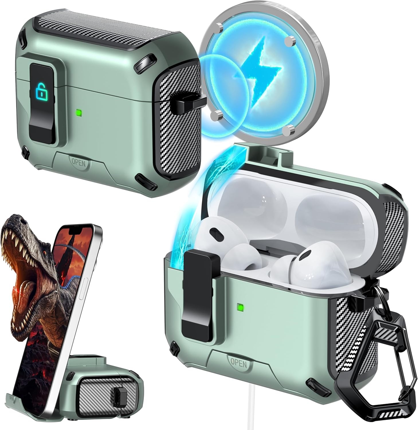 RFUNGUANGO Compatible with AirPods Pro 2 Case with Secure Lock Clip,Automatic Pop-up Case Full-Body Shockproof Hard Protective Cover Compatible with AirPods Pro 2 (2023/2022/2019),Pine Needle Green