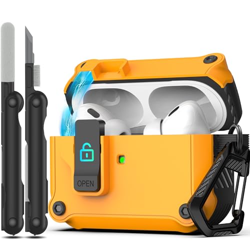 RFUNGUANGO compatible with AirPods Pro 2nd case protective case with cleaning kit, military hard shell protective case with lock for AirPod Pro case(2023/2022/2019),Yellow
