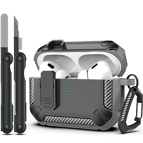 RFUNGUANGO compatible with AirPods Pro 2nd case protective case with cleaning kit, military hard shell protective case with lock for AirPod Pro case(2023/2022/2019),Grey