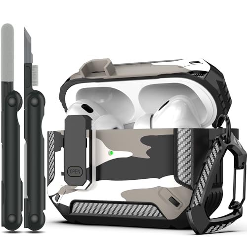 RFUNGUANGO compatible with AirPods Pro 2nd case protective case with cleaning kit, military hard shell protective case with lock for AirPod Pro case(2023/2022/2019),Desert camouflage colour