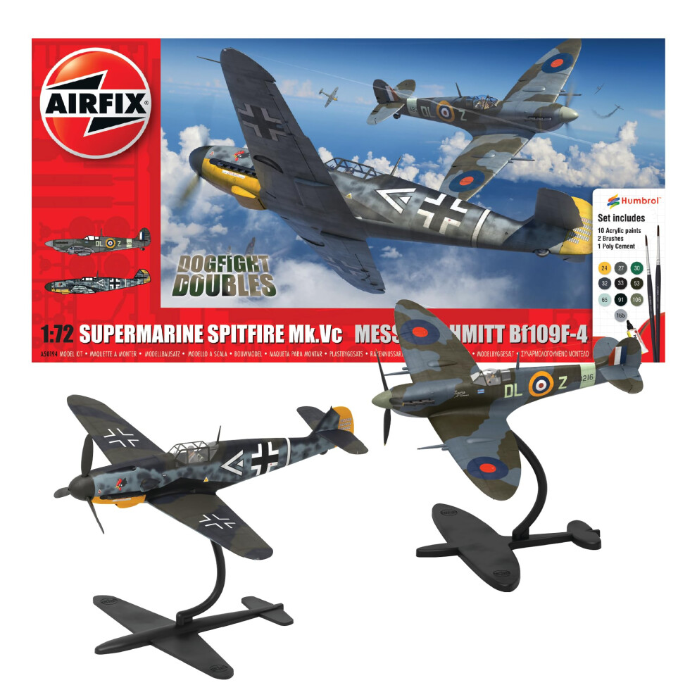 Airfix Gift Set x 2 Kits - Model Plane - A50194 Supermarine Spitfire Mk.Vc and Bf109F-4 Dogfight Double Building Set, 1:72 Scale Kit for Adults & Kid