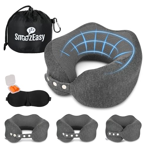 SnoozEasy™ Travel Pillow for Adults | High-Density Memory Foam Neck Pillow for Airplane | Adjustable Flight Travel Cushion with Eye Mask, Ear Plugs, Carry Bag & Carabiner Clip | UK Brand