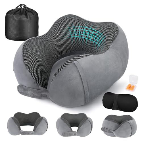 Memory Foam Travel Pillow, Support Neck Pillow for Travel,Includes Storage Bag, Eye Mask, Ear Plugs,Removable Cover, Adjustable Travel Pillow for Airplane,Train,Car & Business Trips(Dark Grey)