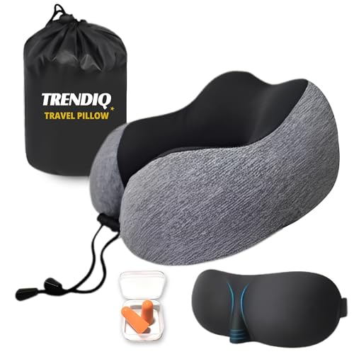 TRENDIQ Travel Pillow for Airplane- Premium Memory Foam with 100% Pure Cotton Cover Neck Pillow for Travel- Adjustable U-Shaped Flight Pillow with Eye Mask, Ear Plugs, Carry Bag & Carabiner Clip