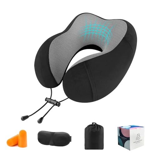 Travel Pillow for Adults,Memory Foam Airplane Pillow with 360 Neck Support, Includes Storage Bag, Eye Mask, Ear Plugs, Adjustable Travel Pillow for Long Flights,Train,Car & Business Trips(Dark Grey)