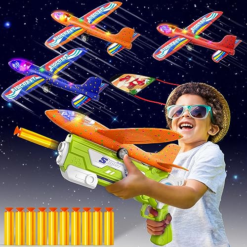 Doloowee 4 IN 1 Airplane Launcher Toys, LED Foam Glider Airplane Catapult, 2 Flight Modes, Outdoor Sports Flying Toys 3-12 Years Old Boys Girls Birthday Gifts