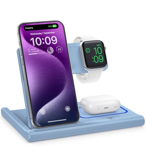 EXW Charging Station,3 in 1 Wireless Charger for iPhone 17/16/15/14/13Pro/12/11/XR/8, Fast Charger for Airpods Pro/4/3/2 and iWatch (Not Adapter,Blue)