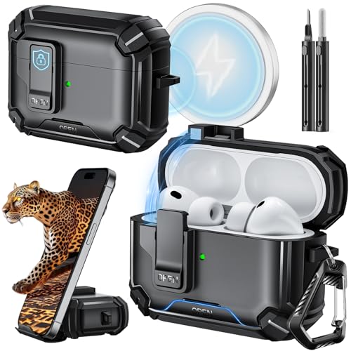 Inesore for AirPods Pro 3 Case (2025) with Phone Stand Design, Compatible with MagSafe, Auto-Locking Case Cover for Air Pods Pro 3rd with Cleaning Kit & Keychain, Black