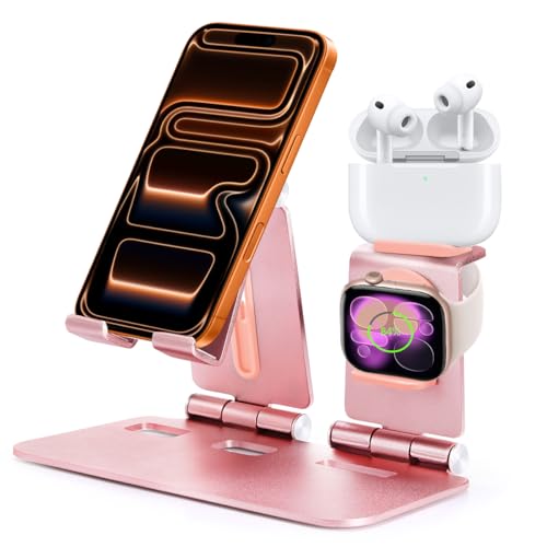 Fingic for Cell Phone Stand for Desk Aluminum 3 In 1 Non-Slip Dual Folding Adjustable Phone Holder for-Apple iphone 17 16 15 14 Pro Max-Watch 10 9 8 7 6&Ultra Series-Airpods 4 3 Pro,Office Accessories