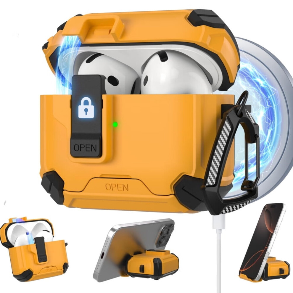 Protective Case for AirPods 4 Gen (2024), Secure Lock Rugged Shockproof Protective with Detachable Carabiner & Keychain, LED Visible Shock Protection