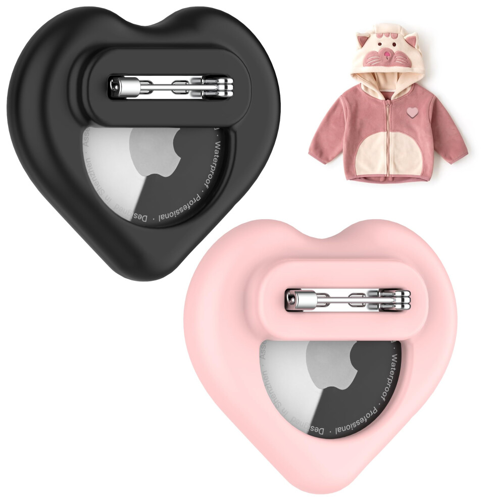 Hidden Silicone Holder for AirTag for Kids 2 Pack with Safety Pin, Heart Design for Clothing Black Pink
