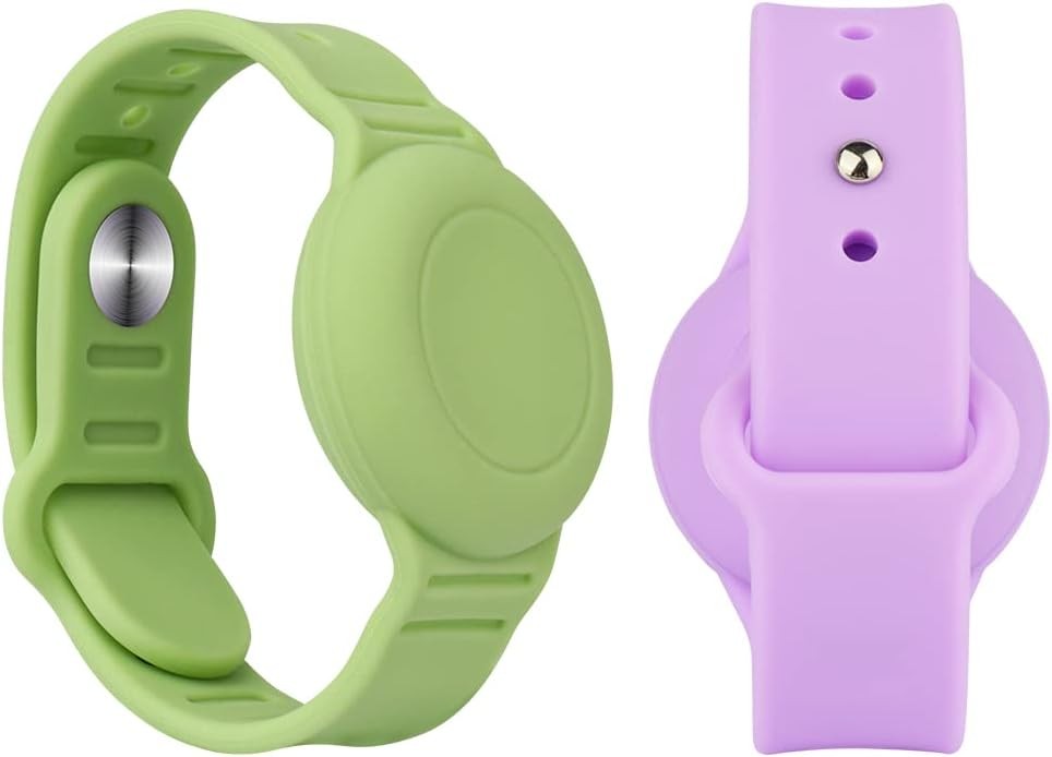 2 Pack Adjustable Silicone Air Tag Bracelets for Kids, Waterproof Lightweight Hidden Wristbands GPS Tracker Holders, Compatible with Apple AirTag Watch Band for Child (Purple & Green)
