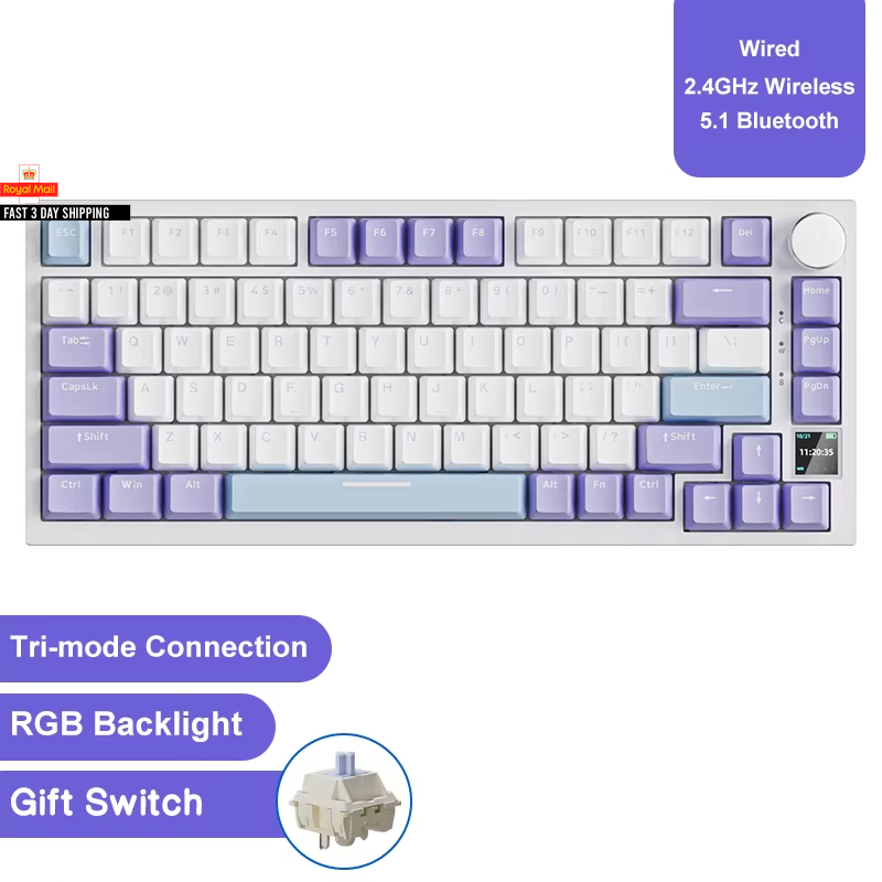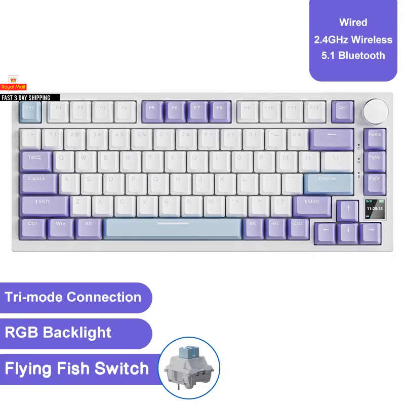 EPOMAKER Ajazz AK820 Pro 75% Gasket-mounted Mechanical Keyboard with TFT Screen, 3 Modes(Bluetooth 5.1/2.4G Wireless & Type-C Wired), Sound Dampening Foams (White Purple, Ajazz Flying Fish Switch)