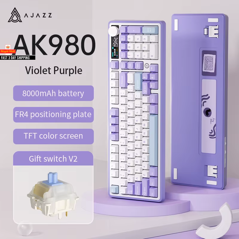 Ajazz AK820 Pro 75% Mechanical Tri-Mode Keyboard, QWERTY US layout, Gasket Mount, Wired/Bluetooth/2.4G, TFT Display, RGB Backlit, Hot-Swappable, Sound-Dampening Foam, PBT Keycaps, Compatible with Win/Mac/PC-Gift Switch Purple