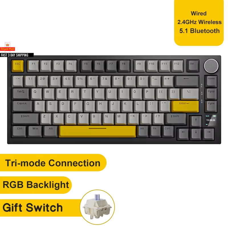 AJAZZ AK820PRO Wireless Mechanical Gaming Keyboard,2.4GHz/Bluetooth/USB-C,75% Layout 81 Keys with TFT Color Display&CNC Knob,Coiled USB C Cable,RGB Backlight Hot-Swappable,4000mAh Battery-Black Yellow