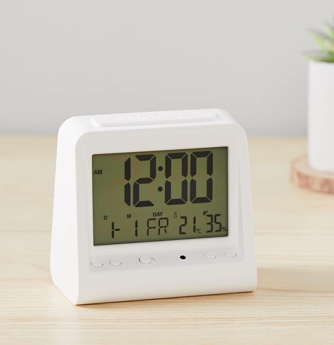 Amazon Basics Tabletop Digital Alarm Clock With Light, Temp & Date Display White