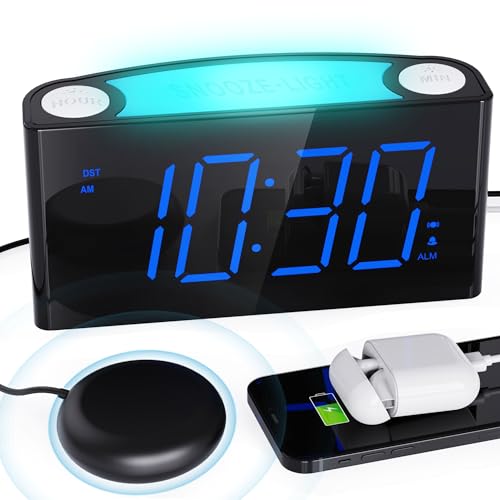 Vibrating Alarm Clock for Heavy Sleeper/Deaf/Hear Impaired, Loud Alarm Clock with Bed Shaker, 7" LED Display & Full Range Dimmer, 7-Color Night Light, 2 USB Ports, Plug-In Clock & Battery Backup