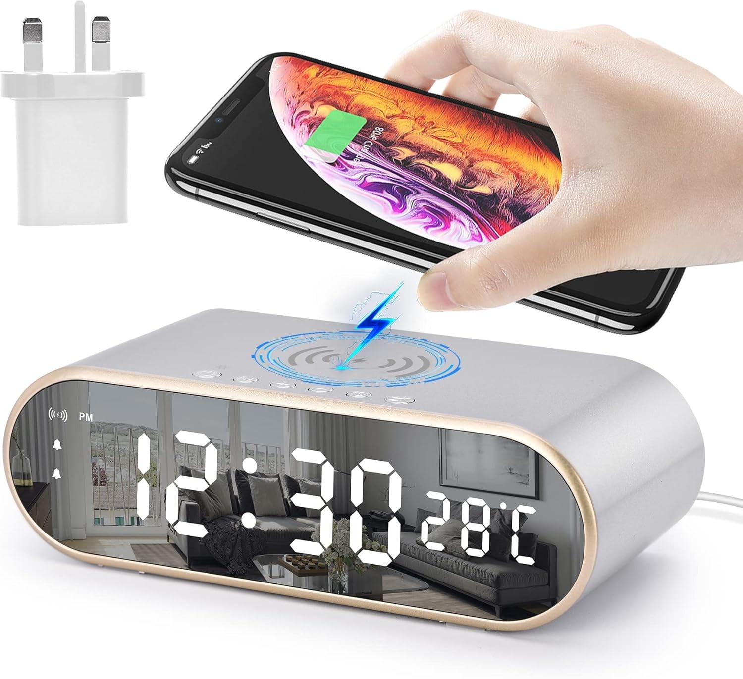 Digital Alarm Clock with Wireless Charging, Mirrored LED Clock for Bedroom3810